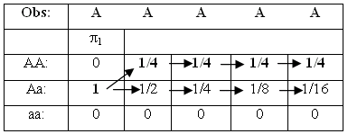 Analyzing an observation sequence by the Viterbi algorithm. The solution of the bet state path is shown with bold face.